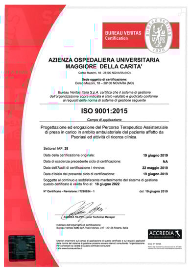 The ISO 9001:2015 certification was awarded for the design and delivery of the DTCP for patients affected by Pso and clinical research in our dermatology clinic.