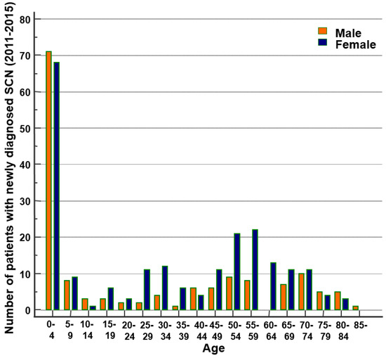 Compared with previous research, this study showed generally similar demographic distribution. In previous studies, SCN was predominantly induced at an early age, with no difference in gender-specific incidence in pediatric patients but female predominance among adult patients [8,9,26,29]. Similar results were obtained in this large cohort study. Of a total of 367 patients, a high proportion was between the ages of 0 and 9. Among pediatric patients, the number of males and females was similar. Increased incidence rates were observed in adult women, especially at the ages of 20–39 years, which had a statistically significantly higher F/M relative risk. Further research on SCN etiology is required in relation to its general prevalence in middle-aged women.