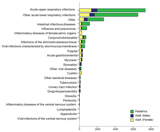 The average number of hospital visits by SCN patients was 29.4 (range: 5–306.0, 95% CI: 26.0–32.9), and the average time from the first claim to the last claim was 34.1 months (range: 10.1–82.2 months, 95% CI: 32.4–35.7). The incidence of infections associated with SCN was analyzed separately in pediatric patients, adult males, and adult females through the number of claims (Figure 2). The total number of claims related to inflammation was highest in pediatric patients, followed by female and male patients. Acute upper respiratory tract infection (URTI) was most frequent, followed by lower respiratory tract infection (LRTI), otitis, intestinal infectious disease, influenza, and conjunctivitis. Infections of the skin and subcutaneous tissue, viral infections of the skin or mucous membrane, pulpitis, acute gastritis or enteritis, mycoses, and stomatitis were frequently encountered. Other bacterial or viral diseases including tuberculosis, urinary tract infections, gingivitis, periodontitis, and unspecified sepsis were also reported. In some patients, glossitis, peritonitis, inflammatory diseases of the central nervous system (CNS), lymphadenitis, and appendicitis were observed. In general, the pattern of accompanying inflammation was similar regardless of sex or age. In pediatric patients, the incidence of respiratory infections was overwhelmingly higher than that of other infections. Unlike in other groups, infections of pelvic organs, cystitis, and conjunctivitis showed relatively frequent occurrence in females.