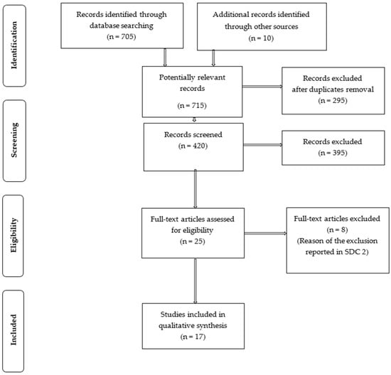The search strategy identified 705 studies and 10 additional records identified through other sources. After de-duplication, 420 citations were screened, of which 397 were excluded based on title and abstract. For the remaining studies, the full texts were obtained and reviewed. Seven studies were excluded based on reasons listed in Table 1 [,,,,,,]. Cumulatively, 17 articles (15 case reports and two case series) were considered relevant, and 38 patients were included (Figure 1, Table 2) [,,,,,,,,,,,,,,,,,,].