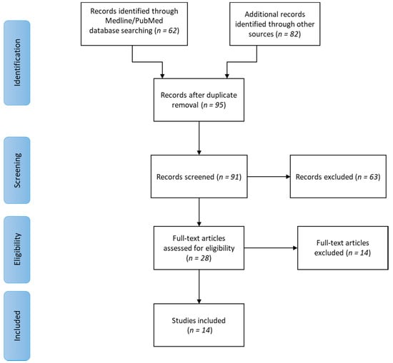 Initially, 144 scientific articles were found. After duplicate removal, 95 articles remained. Four of them were removed because they were not written in English (one in Danish, two in Chinese and one in German) and 63 articles were excluded after evaluation of title and abstract. The full texts of the remaining 28 articles were carefully read. As a result, 14 studies were excluded because they did not expressly identify a condition of LGI in correlation with periodontitis and systemic health. Finally, 14 studies were included in the present review. The flow diagram of the search and selection process is shown in Figure 1.