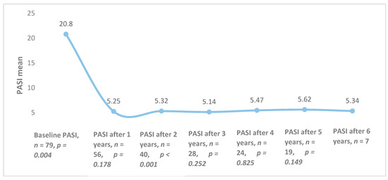 The overall mean PASI was 20.8 ± 8.8 at the initiation of biological therapy, but it differed among different biological agents (p = 0.025): ustekinumab—19.2 (±8.9), etanercept—24.3 (±9.3); infliximab—18.5 (±7.5). After one year of treatment, the average PASI was 5.25 (n = 56, p = 0.178) and it remained quite stable throughout the 6 years of follow-up (Figure 1).
