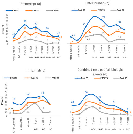 PASI 50, PASI 75 and PASI 90 results throughout 6 years of follow-up with etanercept (a), ustekinumab (b), infliximab (c) and combined results of all biologic agents (d).