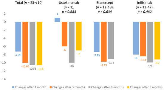 From 2018, DLQI evaluation became mandatory in Lithuania. At baseline, mean DLQI was 14.7 ± 7.3 (n = 25). Changes in DLQI averages were calculated after 1, 3, 6 and 9 months of treatment. The total change in mean DLQI after one month was −7.26 and, after 9 months, it increased to −10.6. Infliximab (n = 11 → 7) showed the largest improvement in scores, and the lowest impact on DLQI was observed in the ustekinumab (n = 1) group. All DLQI mean changes are presented in Figure 3.