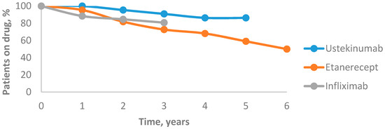 The UK study in 2015 (British Association of Dermatologists Biologic and Immunomodulators Register (BADBIR)) and US study in 2016 (PSOLAR) compared the drug survival of TNF-α and IL-12/23 inhibitors in patients with psoriasis. Both of them observed significantly higher drug survival of ustekinumab for biologically naïve and biologically experienced patients, whereas, for TNF-α inhibitors, adalimumab demonstrated the longest drug survival [32,33]. This study data indicated that the highest drug survival occurred for ustekinumab. In previously mentioned studies, predictors of treatment failure were identified, such as female gender, current smoking status, a higher baseline DLQI and being on etanercept or infliximab, while being on ustekinumab and having psoriatic arthritis led to longer drug survival. Moreover, adalimumab was compared with other TNF-α inhibitors and the results have shown that infliximab was a predictor of discontinuation due to adverse events, while etanercept caused discontinuation due to inefficiency [32,33]. The main reason for therapy discontinuation in this study was a lack of efficacy. Interestingly, compared with no use of methotrexate (MTX), concomitant MTX was independently associated with a shorter time to discontinuation of biologics only in first-line therapy, as reported in the PSOLAR study [32,33]. According to this study, the longer treatment duration with biological therapy was in the group of patients with concomitant MTX than in biological agents alone.