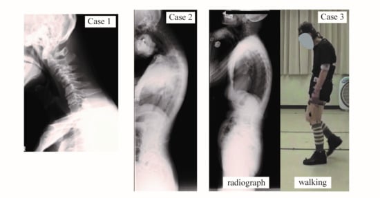 Although there are multiple recent reports on functional gait recovery after using HAL in patients with mobility issues due to various neurological disorders [,,,,,,,], there are only very few studies focusing on using HAL for spinal deformity. Evaluating immediate and lasting effects of gait treatment using HAL for spinal deformity, this study investigated the cervical alignment during gait of three dropped head syndrome (DHS) patients who underwent a total of 10 HAL gait sessions at different frequencies. Case 1 underwent HAL training at the frequency of 5 times per week in the first application of HAL, and once per month in the second application of HAL, 10 months after the first application of HAL. Case 2 underwent HAL sessions once per week and Case 3 once per 2.5 weeks. The immediate effect was defined as the effect of HAL observed in each single session, while the lasting effect was defined as the effect of HAL after a course of treatment.