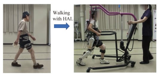 On the other hand, even though the participants of this study underwent HAL treatments at different frequencies, the relationship between the frequency and outcomes of each participant was not clear. Hence, the optimal frequency of HAL for DHS remains as an open question. A recent study on spinal cord injury patients [] reported that combination of an intensive frequency (once per day) at the beginning phase for 12 weeks and a mild frequency (once per week) at the continuing phase can be a candidate of optimal schedule, to obtain improvement in the intensive phase and maintain the improved gait through the mild phase. Exploration of such planning for DHS patients remains for future investigation.