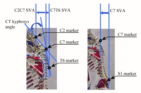 Spinal parameters of cervical SVA (sagittal vertical axis) (C2C7SVA), upper thoracic SVA (C7T6 SVA), spinal SVA (C7SVA), and cervico-thoracic kyphosis angle (CT kyphosis) during walking were extracted from the motion capture data. The SVA parameters were calculated respectively as the sagittal distance between the C2 and C7 markers, C7 and T6 markers, and C7 and S1 markers (Figure 3). CT kyphosis was calculated as the angle between the line that goes through C2 and C7 and the line that goes through C7 and T6, within the sagittal plane. Gait cycles were detected, according to the foot markers, as starting from a left heel landing and ending with the next left heel landing. The spinal parameters were segmented into gait cycles and averaged within the cycles to obtain representative alignment within a cycle. Then, the value is averaged among the extracted gait cycles to obtain SVA parameters of a gait.