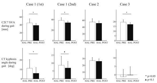 Positive immediate effects on the reduction of C2C7SVA was observed in Case 1 (1st), Case 1 (2nd), and Case 3, and on the reduction of CT kyphosis angle in Case 1 (1st), Case 1 (2nd). The apparent immediate effects of HAL suggest that the effect of walking with HAL can cause some changes in the coordination of neck and leg muscles [] during gait, rather than training of the neck extensor muscle strength. Immediate effect of HAL is reported also on the improvement of gait [] and upper limb motion [] in children with cerebral palsy whose problems are in the coordinated control of the limb muscles rather than the muscle force.