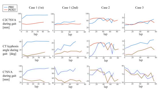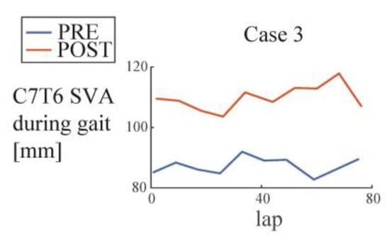 Case 1 (1st) showed reduction of the spinal parameters during long-time walking in POST compared with PRE; C2C7SVA (Figure 5, regression coefficients: PRE 81 mm and POST 36 mm, p = 1.57 × 10−5), CT kyphosis angle (regression coef. 34 and 6.2 deg, p = 1.97 × 10−5), and C7SVA (mean values 111 and 37 mm, p = 5.60 × 10−8). Case 1 (2nd) also showed reduction of C2C7SVA (mean values 49 and 37 mm, p = 0.0024), CT kyphosis angle (mean values 15 and 6.4 deg, p = 0.0013), and C7SVA (regression coef. 88 and 54 mm, p = 0.000237). Case 2 did not show statistically significant reduction. Case 3 showed reduction of CT kyphosis angle (regression coef. 2.1 and −7.0 deg, p = 4.11 × 10−7) but not of C2C7SVA or C7SVA. The p-values of the statistical tests are summarized in Table 2.