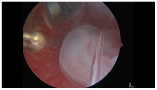 - Case 1. Hysteroscopy was performed in two steps. During the first phase a 5 mm Bettocchi hysteroscope (Storz®, Karl Storz SE & Co, Tuttlingen, Germany) with 5 Fr bipolar electrode Versapoint Twizzle (Gynecare®) was used to identify the GS: it was opened and the pregnancy terminated by cord section and vessels were partially coagulated; subsequently, the cervix was dilated and we performed a resectoscopy. During the second phase the GS and the embryo were removed and a 10 mm resectoscope with bipolar Versapoint (Gynecare®) was used to obtain a complete resection of the residual chorial villi. Lastly, we performed an electrocoagulation of the bleeding vessels on implantation site, in order to control the hemostasis (Figure 1, Figure 2, Figure 3 and Figure 4)