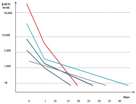| Cases | GA (Weeks) | Basal βhCG mUi/ml | Management | βhCG mUi/mL after Procedure | Time until βhCG Undetectable < 5 mUi/mL (Days) | Outcomes |