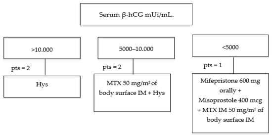 - Case 5. A total medical management was chosen considering the 10 weeks of amenorrhea but the six weeks of GA at ultrasound evaluation. Furthermore, the βhCG level of 1331 mUi/mL led us to use a single dose of MTX IM 50 mg/m2 of the body surface in addition to Mifepristone 600 mg and Misoprostol 400 mcg orally (Table 1; Figure 5).