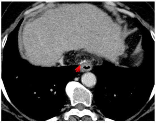 Axial contrast-enhanced CT shows enlarged paraoesophageal varices (red arrow).