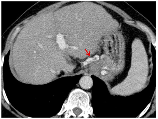 Axial contrast-enhanced CT shows enlarged left gastric vein (red arrow).