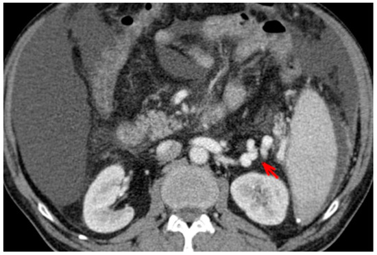 Axial contrast-enhanced CT shows spleno-renal shunt (red arrow).