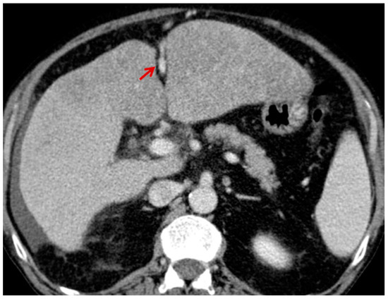 Axial contrast-enhanced CT shows repermeabilized round ligament (red arrow).