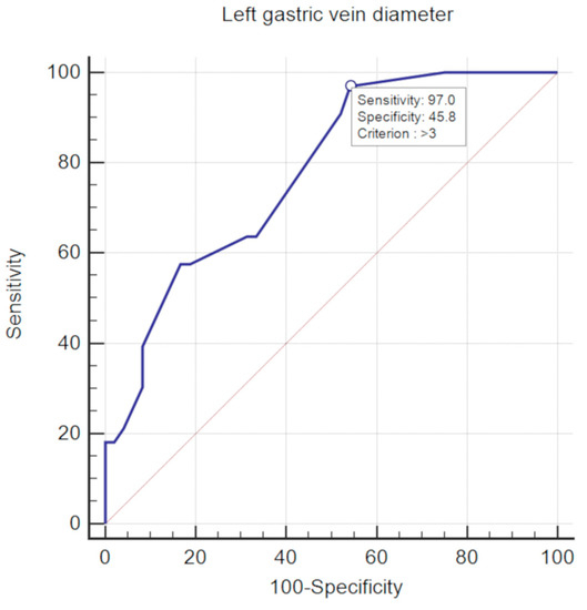 Furthermore, we found an optimal cut-off value of 3 mm for the diameter of the left gastric vein (Figure 6) useful to discriminate among patients with variceal hemorrhage from the ones without it, with a good diagnostic performance (AUC = 0.78, 95% CI:0.674–0.864). The mean sensitivity and specificity for this cut-off value were 97% (CI: 84.2%–99.9%), and 45.8% (31.4%–60.8%), respectively, while the mean PPV and NPV were 55.2% (CI: 41.5%–68.3%), and 95.7% (CI: 78.1%–99.9%), respectively.
