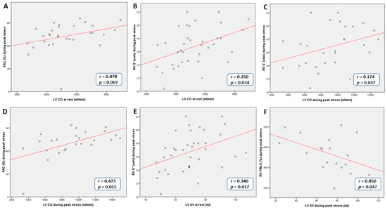 Correlations between: A—LV CO at rest and FAC during peak stress; B—LV CO at rest and RV S’ during peak stress; C—LV CO during peak stress and RV S′ during peak stress; D—LV CO during peak stress and FAC during peak stress; E—LV SV at rest and RV S′ during peak stress; F—LV SV during peak stress and RV FWLS.