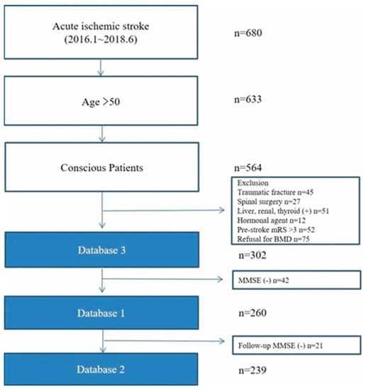 We included consecutive patients with acute ischemic stroke who were hospitalized at the Chuncheon Sacred Heart Hospital between January 2016 and June 2018. All patients over 50 years of age were subjected to routine bone densitometry within 7 days of stroke onset. We excluded patients who had a surgical or medical history affecting bone turnover (traumatic fracture; spinal surgery; liver, renal, or thyroid disease; and hormonal agent use) and a pre-stroke modified Rankin Scale (mRS) score of >3. All females enrolled in this study were menopausal. Unconscious patients whose cognitive function was unable to be assessed were also excluded. We established three databases to investigate the effects of osteoporosis on cognitive function and WMD. Because patients with severe neurological deficits were unable to perform or refuse cognitive function tests, we established three separate databases: database 1 excluded subjects who were not able to complete the Korean Mini-Mental State Examination (K-MMSE), evaluating the effect of osteoporosis on cognitive function during hospitalization; database 2 excluded subjects who were not able to complete the K-MMSE at 1 year after stroke onset; and database 3 included all eligible subjects with WMD (Figure 1). Bone loss is accelerated during the first year after stroke [], and the risk for post-stroke cognitive impairment is known to be highest within the first year []. Hence, we assessed the BMD at the early phase of stroke and the cognitive function test at hospitalization and 1 year after a stroke.