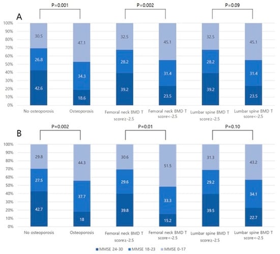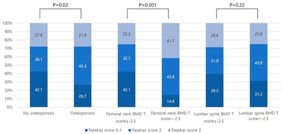 In this study, we separately analyzed the effect of BMD of the femoral neck (Model 1) and BMD of the lumbar spine (Model 2) on the outcomes. The osteoporosis group was a combination of the BMD T-score <−2.5 of the femur neck and lumbar spine. With respect to the primary and secondary outcome measures, the osteoporosis and non-osteoporosis groups were compared using Pearson’s chi-squared test, and independent effects of osteoporosis on those outcome measures were analyzed using multivariate regression analysis. The multivariate analysis was adjusted for variables selected based on p-values <0.1 in the comparisons of groups stratified according to osteoporosis severity, and clinically plausible associations with each outcome variable were determined. Moreover, an interaction analysis was performed as to whether WMD modified the association between BMD and cognitive impairment.