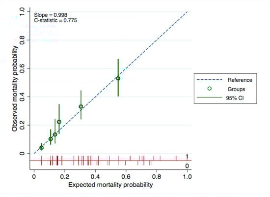 Calibration plot between observed and expected mortality probabilities. CI = Confidence Interval.