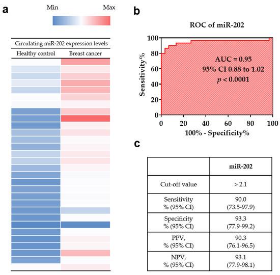 Several studies have investigated the circulating miRNAs for breast cancer. Chen et al. showed that the expression levels of miR-127-3p, miR-148b, miR-409-3p, miR-376a, miR-376c, miR-652, and miR-801 in the plasma of breast cancer patients were higher than the plasma of healthy controls. The diagnostic potential of these seven circulating miRs combined in 120 breast cancer patients showed an AUC value of 0.81 (95% CI 0.72–0.91) [40]. Additionally, Schrauder et al. reported that serum concentrations of miR-106a-5p and miR454-3p were higher in cancer patients than in healthy controls, whereas those of miR-195-5p, miR-495, and miR-34a-5p were downregulated in breast cancer patients. miR-195-5p and miR-495 can help differentiate between breast cancer and healthy controls with AUC values (sensitivity, specificity) of 0.901 (77.8%, 100%) and 0.901 (100%, 66.7%), respectively [37]. The sensitivity and specificity of miR-202 were comparable to those of other miRs for the breast cancer diagnostic method.