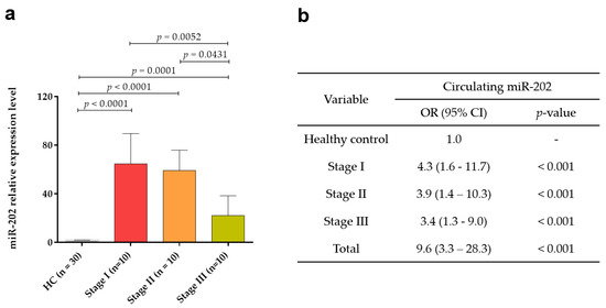 Subsequently, the expression levels of circulating miR-202 were analyzed according to TNM stages, revealing a statistically significant difference between the expression level of each stage and healthy control (p < 0.001 for stage I, p < 0.001 for stage II, and p = 0.001 for stage III; Figure 2a). Importantly, the positivity rate was 95% (19/20) for early stage (stages I and II; Figure 2a).