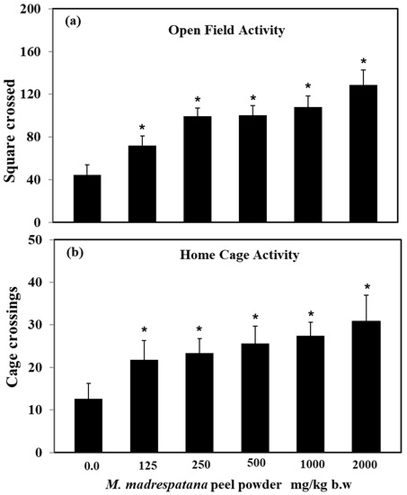 Effects of M. madrespatana with various doses in a novel (a) and familiar (b) environment. Values are means ± standard deviation (n = 5) 4 weeks after the administration of the drug. Significant differences by Tukey’s test * p < 0.05 from control animals following one-way ANOVA.