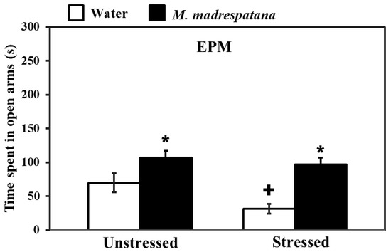 Effects of administration of M. madrespatana on the anxiety profile in unstressed and stressed rats observed in EPM. Values are mean ± standard deviation (n = 5). Data were analyzed by Tukey’s test following two-way ANOVA. Statistical difference is expressed as * p < 0.05 versus respective control and + p < 0.05 versus unstressed rats.