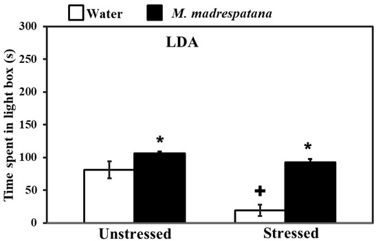 Effects of administration of M.M. on anxiety profile in unstressed and stressed rats observed in the light-dark activity box. Values are mean ± standard deviation (n = 5). Data were analyzed by Tukey’s test following two-way ANOVA. Statistical difference is expressed as * p < 0.05 versus respective control and + p < 0.05 versus unstressed rats.