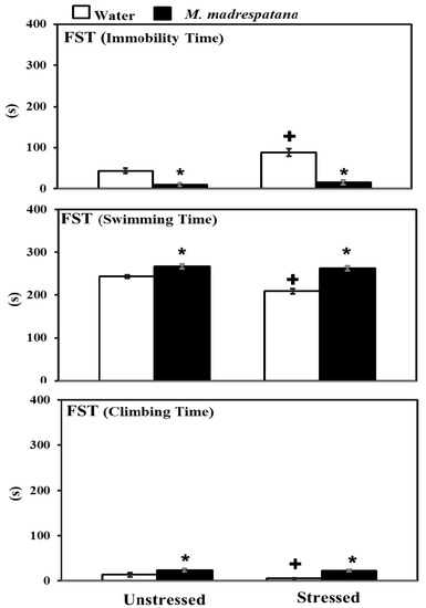 Effects of M. madrespatana administration following immobilization stress on immobility, swimming, and climbing time in FST. Values are mean ± standard deviation (n = 5). Data were analyzed by Tukey’s test following two-way ANOVA. Statistical difference is expressed as * p < 0.05 versus respective control and + p < 0.05 versus unstressed rats.