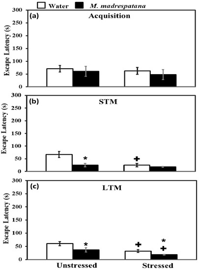Effect of M. madrespatana administration following single stress on acquisition (a) STM (b) and LTM (c) in terms of escape latency (s) assessed by MWM. Values are mean ± standard deviation (n = 5). Data were analyzed by Tukey’s test following two-way ANOVA. Statistical difference is expressed as * p < 0.05 versus respective control and + p < 0.05 versus unstressed animals.