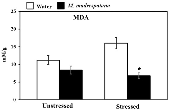 Effects of M. madrespatana administration following immobilization stress on hippocampal MDA activity. Values are mean ± standard deviation (n = 5). Data were analyzed by Tukey’s test following two-way ANOVA. Statistical difference is expressed as * p < 0.05 versus respective control and + p < 0.05 versus unstressed animals.