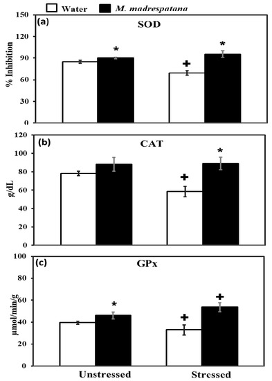 Effect of M. madrespatana administration following immobilization stress on hippocampal SOD (a), CAT (b), and GPx (c) activity. Values are mean ± standard deviation (n = 5). Data was analyzed by Tukey’s test following two-way ANOVA. Statistical difference is expressed as * p < 0.05 versus respective control and + p < 0.05 versus unstressed rats.