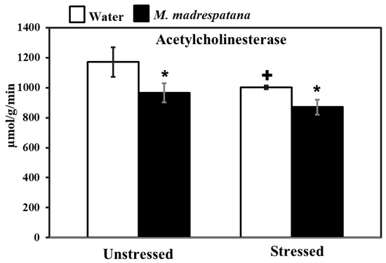 Effects of M.M. administration following immobilization stress on AChE activity in the hippocampus. Values are mean ± standard deviation (n = 5). Data were analyzed by Tukey’s test following two-way ANOVA. Statistical difference is expressed as * p < 0.05 versus respective control and + p < 0.05 versus unstressed animals.