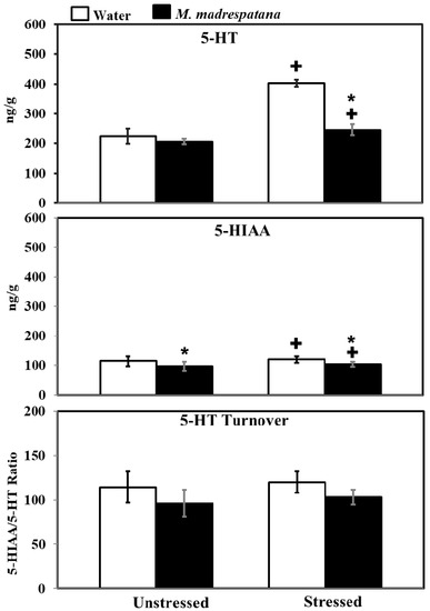 Effect of M. madrespatana administration following immobilization stress on 5-HT, 5-HIAA levels, and 5-HT turnover in terms of 5-HIAA/5-HT ratio in the hippocampus. Values are mean ± standard deviation (n = 5). Data were analyzed by Tukey’s test following two-way ANOVA. Statistical difference is expressed as * p < 0.05 versus respective control and + p < 0.05 versus unstressed animals.