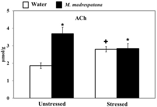 Effect of M. madrespatana administration following immobilization stress on ACh levels in the hippocampus. Values are mean ± SD (n = 5). Data were analyzed by Tukey’s test following two-way ANOVA. Statistical difference is expressed as * p < 0.05 versus respective control and + p < 0.05 versus unstressed animals.