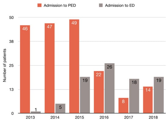 Number of admissions in ED (Emergency Department) and PED (Pediatric Emergency Department) in years 2013 to 2018.
