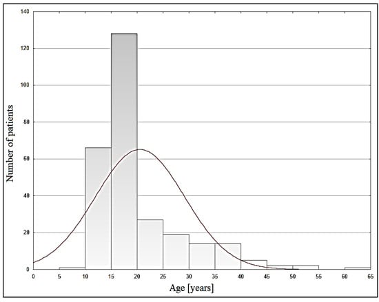 We evaluated the number of hospitalizations among juvenile and adult patients due to the NPS use in the years between 2013 and 2018. The NPS use was found to be twice as high in juvenile patients as the number of hospitalizations among adults. The total number of hospitalizations was 186 (66% of all NPS use patients) in the Pediatric Emergency Department (PED) of the Provincial Specialist Children′s Hospital in Olsztyn and 96 (34%) in the Hospital Emergency Department WSS in Olsztyn (Figure 1). In the analysis, a total of 282 patients were included in the age range of 10–63 years: a median of 17 years (16–23 IQR (interquartile range)) (Figure 2). In both the analyzed groups, the majority of patients were male (ED: 90 males vs. 6 females; PED:149 males vs. 47 females). The characteristics of the study groups are presented in Table 1.