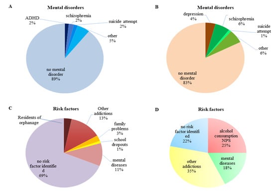 Pie charts depicting classification of mental disorders and risk factors associated with prevalence of NPS use in juveniles (A,C) and in adults (B,D). ADHD: attention deficit hyperactivity disorder. NPS: new psychoactive substances.