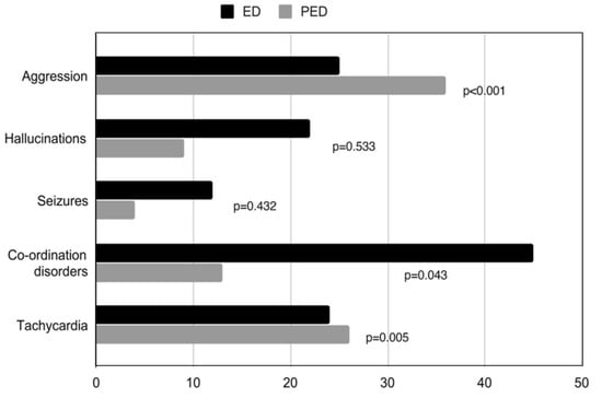 In both groups of hospitalized patients, similar signs and symptoms of NPS use were noted. Both somatic (i.e., brady- or tachycardia, vomiting, increased blood pressure, stress, co-ordination disturbance and dysarthria) and mental (e.g., behavioral deviations, including verbal and physical aggression, cheerfulness, positive symptoms, psychomotor retardation and consciousness disturbances) symptoms were observed (Figure 4). A total of 36 out of 96 patients in ED (37.5%) presented aggressive behavior, of which over one third required direct coercion. In the PED, only 25 out of 186 patients (13%) presented aggressive behavior.