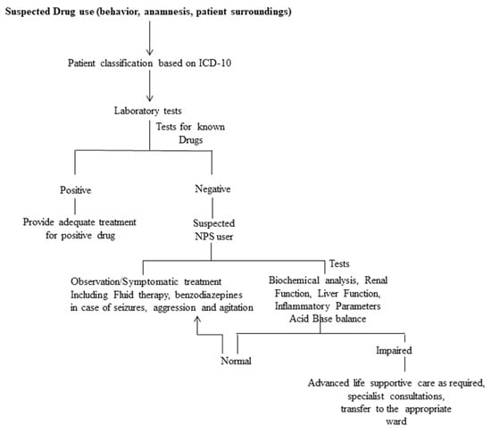 Greater predisposition to taking so-called “legal highs” were shown by male patients in both groups, alcoholics and patients using other psychoactive substances, patients with mental disorders (mainly schizophrenia and depression) and young people in difficult socio-economic and family situations. There was no unambiguous toxidrome or biochemical pattern that was characteristic of taking these substances. According to the treatment protocols used in our hospitals, a general therapeutic strategy as shown in Figure 5 should be primarily guided by the clinical picture. The results of basic laboratory tests, including creatinine, liver function tests (LFTs), leukocytosis or blood counts could allow detection and monitoring of progression of patient’s general condition. Monitoring vital functions and fluid therapy was helpful during treatment. Moreover, evaluation of blood morphology, coagulation parameters, liver and kidney function can be helpful in the diagnostic and therapeutic process, which in our study was based mainly on symptomatic management. The symptomatic treatment was effective and sufficient in most patients.