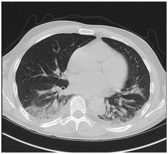 Multifocal ground glass density lesions were observed on a CT scan in the lower lobes bilaterally.