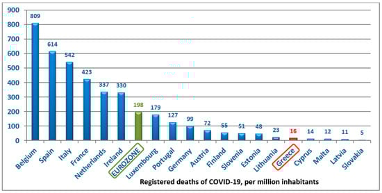 In relation to its population, Greece has 16 deaths per million population (1 M), which ranks the country in 70th place internationally (44.5/1 M, 215 countries), 39th in Europe (169.6/1 M, 50 countries) and 15th in the Eurozone (198/1 M, 19 countries) (Figure 3). The Case Fatality Rate (CFR: ratio between confirmed deaths and confirmed cases) in Greece is 5.9%, which is below the global average (6.2%) [,,].