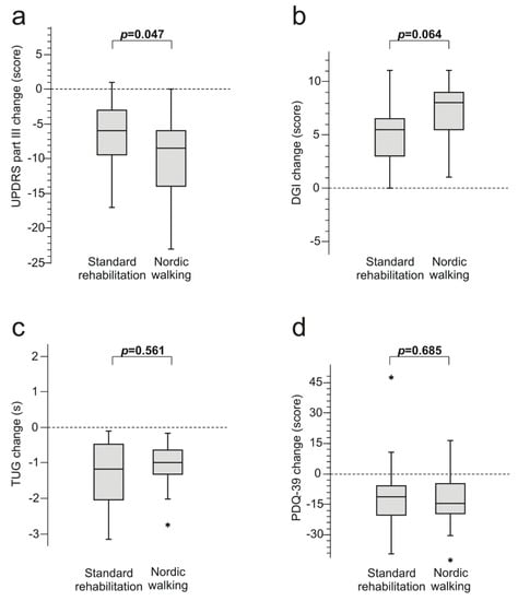 The median values of UPDRS, DGI, TUG, and PDQ-39 significantly improved in both rehabilitation groups (all differences between baseline and the end of study, p < 0.001, except for the change in the SR group in PDQ-39, p = 0.008) (Figure 1a). The median improvement in UPDRS part III score exceeded the 5-point MCIC in both rehabilitation groups; therefore, functional improvement in both groups was considered clinically significant. After 6 weeks of the NW program, functional impairment reduction measured by UPDRS part III scores was significantly greater (p = 0.047) than after SR (reduction of 8.5 vs. 6.0 points, respectively).