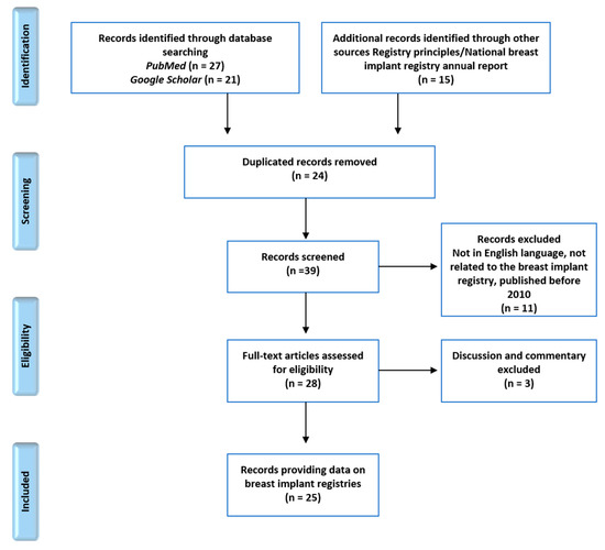 A total of 63 articles were reviewed. Forty-eight articles were identified from the two search interfaces using the previously mentioned search terms. Fifteen additional articles about registry principles and national breast implant registry annual reports from four countries were included in the review process. After removing 24 duplicates, 39 records were screened for national information on breast implant registries. Non-English articles, unrelated articles, and articles published before 2010 were excluded. In addition, articles containing only discussion or commentaries were removed. A total of 25 national breast implant registry-related articles were included in the full-text synthesis (Figure 1).