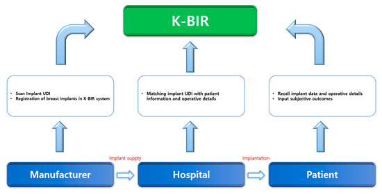 Fourth, when gathering data, it is important to develop an interface suitable for producing statistics in a time-efficient manner. The current K-BIR pilot project will generate paper reports and transmit the data to MFDS. However, this is time consuming, and the accuracy may be low. Based on multiple consultations, we concluded that an electronic data entry system that can be used immediately in the operating theatre can facilitate data capture and potentially improve completion rates and data accuracy. Therefore, we propose an application platform that the manufacturer, surgeon, and patient can access. Within the system, it is possible to identify where the implant was used and for which patients. When the manufacturer produces the breast implant and delivers it to the medical institution, the corresponding UDI is scanned and registered by the application. As this implant with the UDI is inserted, operative details can be registered by the surgeon. Furthermore, when patients access the application, they can check the type, manufacturer, and surgical information of the breast implant through the individually linked UDI (Figure 2). Currently, South Korea has started the pilot study for national breast implant surgery, and about over 300 patients have been registered until now. Before registration, we have received informed consent from all patients. If the patient refuses to enroll, they are excluded from the registry. After registration, patients’ personal information undergoes a de-identification process and cannot be accessed. Their personal information can only be accessed when there is a newly developed safety issue, such as BIA-ALCL crisis, and it is necessary for patients to be informed of it. Manufacturers can only trace the status of implants they produced, whether they are used for patients or not. In other words, when implants remain in stock or are returned, their information is removed out from the registry and only implants used are left in the registry. The hospital has authority to access surgical and implant information of the patients they operated on, not all patients. Patients can be logged in the registry after identification with their resident registration number. The patient has the authority to access their own surgical and implant information, not that of other patients on the registry. After tripartite coordination, the K-BIR application can eventually become transparent with manufacturers, institutions, and patients. Moreover, PROM is not yet included in the tentative K-BIR dataset to increase the compliance rate, but the K-BIR application intends to include PROM in the future. Recently, the importance of subjective evaluation by patients, as well as the judgment of doctors, has been supported when determining surgical outcomes. In addition, although significant scientific evidence is not yet available, studies on breast implant illnesses are increasing [31,32,33,34,35]. Therefore, a platform must be developed in which the patient can evaluate the surgical outcomes on their own and obtain more information regarding the quality of all registered breast implants by linking patient feedback to the clinical data.