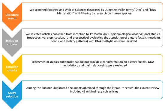 Search strategy and selection criteria of epidemiological studies examining the association between dietary factors and DNA methylation.