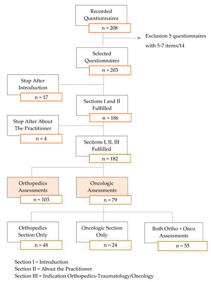 Summary statistics, namely percentages, are reported. Questionnaires were distinguished according to the indication, either orthopedics or oncology.